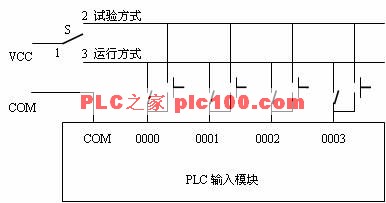 為節省輸入口數量,節省投資,本系統運行/試驗功能的轉換采用了對I/O模塊接線的優化,使PLC輸入模塊中1個輸入節點起到2個輸入節點的作用,完成PLC工作在兩種方式下的I/O功能。參見圖二I/O模塊接線的優化。