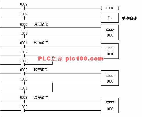 = 2 \* GB3 ② 采用IL/ILC分支指令,通過0008旋鈕實現手動/自動兩種功能的選擇,當0008旋鈕閉合時,自動指示燈亮,系統執行IL/ILC分支內程序,完成自動監控;當0008旋鈕打開時,手動指示燈亮,系統執行分支外程序,通過0010、0011旋鈕實現手動啟泵、停泵。