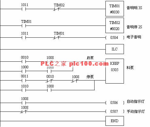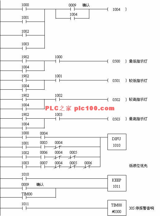 = 5 \* GB3 ⑤ 當液位到達檢測點時,液位指示燈閃爍,燈光閃爍因子采用內部閃爍內標1902,以1S為周期閃爍;若液位到達設定值時,自動停泵,并設置電子音響報警,報警聲設計為響3S停2S,循環30S后自停,或在30S內按0009確認按鈕停音響,指示燈傳平光。電子音響報警和泵的啟停同樣考慮液位的波動影響,設計時采用KEEP保持指令和DIFU微分指令聯合使用。