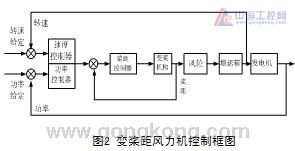 如圖2所示為變槳距控制器的原理框圖。在發(fā)動(dòng)機(jī)并入電網(wǎng)之前由速度控制器根據(jù)發(fā)動(dòng)機(jī)的轉(zhuǎn)速反饋信號(hào)進(jìn)行變槳距控制,根據(jù)轉(zhuǎn)速及風(fēng)速信號(hào)來確定槳葉處于待機(jī)或順槳位置;發(fā)動(dòng)機(jī)并入電網(wǎng)之后,功率控制器起作用,功率調(diào)節(jié)器通常采用PI(或PID)控制,功率誤差信號(hào)經(jīng)過PI運(yùn)算后得到槳距角位置。