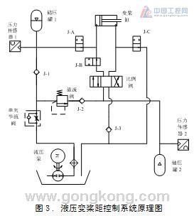 本文實(shí)驗(yàn)中采用國(guó)外某知名風(fēng)電公司風(fēng)力發(fā)電機(jī)組作為實(shí)驗(yàn)對(duì)象,其額定功率550KW,采用液壓變槳系統(tǒng),液壓變槳系統(tǒng)原理圖如圖3所示。從圖3中可以看出,通過改變液壓比例閥的電壓可以改變進(jìn)槳或退槳速度,在風(fēng)力機(jī)出現(xiàn)故障或緊急停機(jī)時(shí),可控制電磁閥J-B閉合、J-A和J-C打開,使儲(chǔ)壓罐1中的液壓油迅速進(jìn)入變槳缸,推動(dòng)槳葉達(dá)到順槳位置(90�)。