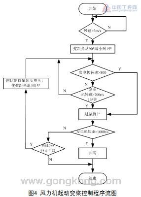 風(fēng)力機(jī)起動(dòng)時(shí)變槳控制程序流程如圖4所示。當(dāng)風(fēng)速高于起動(dòng)風(fēng)速時(shí)PLC通過模擬輸出單元向比例閥輸出1.8V電壓,使葉片以0.9�/s的速度變化到15�。此時(shí),若發(fā)電機(jī)的轉(zhuǎn)速大于800r/min或者轉(zhuǎn)速持續(xù)一分鐘大于700r/min,則槳葉繼續(xù)進(jìn)槳到3�位置。PLC檢測(cè)到高速計(jì)數(shù)單元的轉(zhuǎn)速信號(hào)大于1000r/min時(shí)發(fā)出并網(wǎng)指令。若槳距角在到達(dá)3�后2分鐘未并網(wǎng)則由模擬輸出單元給比例閥輸出-4.1V電壓,使槳距角退到15�位置。