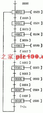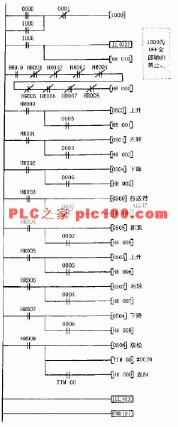 按下起動(dòng)按鈕SB1,輸入點(diǎn)0000為ON,則作為互鎖條件的輔助繼電器1000為ON,互鎖指令I(lǐng)L接通,IL與ILC之間的線圈正常工作,“全部輸出禁止”解除。若(抓圖1)常閉觸點(diǎn)都為ON,保持繼電器HR000接通,輸出點(diǎn)0503使上升電磁閥得電,手臂上升。當(dāng)手臂上升到位時(shí),上升限位開關(guān)使輸入點(diǎn)0005閉合,保持繼電器HR001 接通,HR000復(fù)位,輸出點(diǎn)0501使左轉(zhuǎn)電磁閥得電,手臂左轉(zhuǎn)。......以后每當(dāng)一步動(dòng)作到位,限位條件滿足時(shí),狀態(tài)轉(zhuǎn)移,進(jìn)行下一工步動(dòng)作。當(dāng)狀態(tài)轉(zhuǎn)移到HR008為ON時(shí),輸出點(diǎn)0506使放松電磁閥得電,機(jī)械手放松,同時(shí)定時(shí)器TIM00計(jì)時(shí)。當(dāng)計(jì)時(shí)2秒到,狀態(tài)又轉(zhuǎn)移到HR000,程序又重新從第一工步開始循環(huán)。