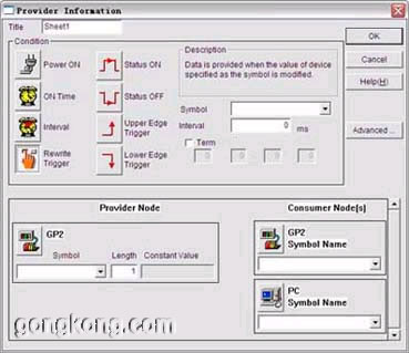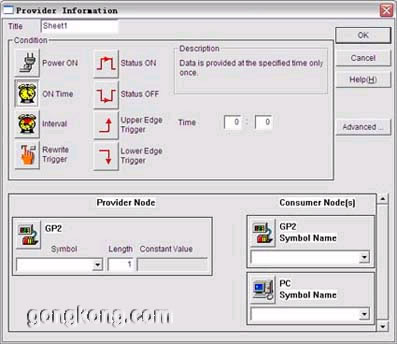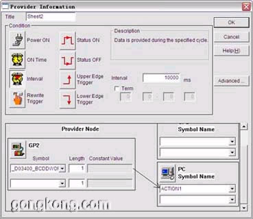 下圖表示每隔10000ms就將GP2節點上地址D03400的BCDWORD傳給PC節點,在PC節點上執行ACTION1。