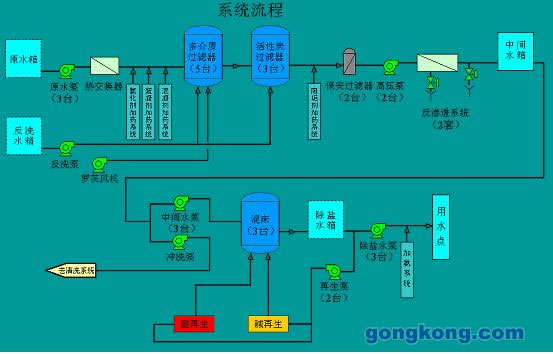本例根據原水水質條件、鍋爐汽水系統對補給水的水質要求,鍋爐補給水處理系統流程為:原水→原水箱→原水泵→熱交換器→多介質過濾器→活性炭過濾器→反滲透預脫鹽系統→中間水箱→中間水泵→混和離子交換床→除鹽水箱→除鹽水泵→主廠房。另外包括過濾器反洗系統、混合離子交換床再生系統、加藥系統等。